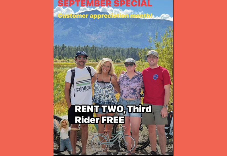 September Special! In honor of customer appreciation month, we're offering great deals to our loyal patrons! Rent two bikes, and receive the third in your group for free! If you have a large group, even better! This special is not limited to one per group! Use as many as you like! Happy Trails!