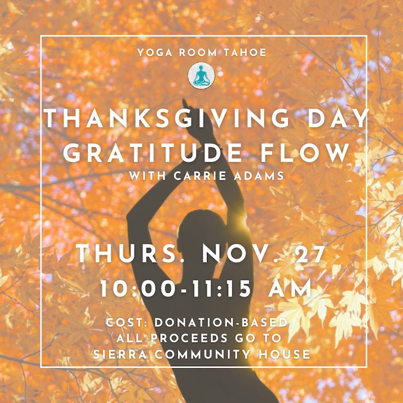 Join The Yoga Room for a very special Thanksgiving Day yoga flow for all levels. A portion of the proceeds for this class will benefit the Sierra Community House, a local nonprofit bringing food relief and services to the community in North Lake Tahoe.