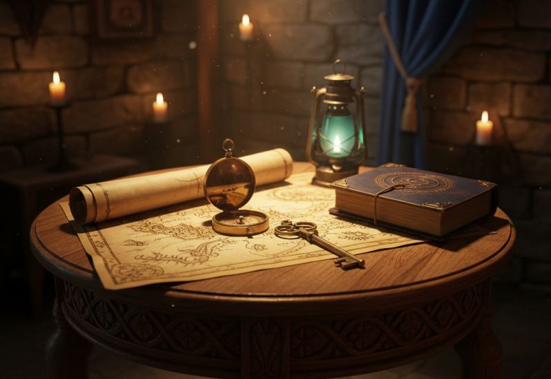 Golden light flickers over ancient maps and secrets. Can you uncover the mystery waiting in the shadows?