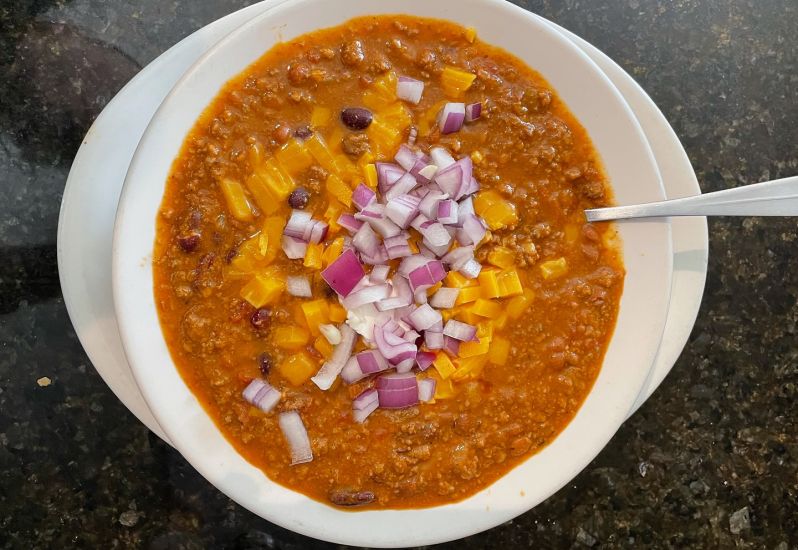 Homemade Beef Chili = Comfort Food! Whether you have it as your main, as a side with your lunch, or throw it on top of an omelet or fries- you can’t go wrong!