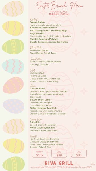 Join us on Easter Sunday for a delicious brunch with stunning views of the lake. Enjoy family-friendly fun, an egg hunt & special visit from the Easter Bunny, and a memorable experience by the water. Lunch menu will be available starting at 12:30pm until 5pm. Dinner starts at 5pm.