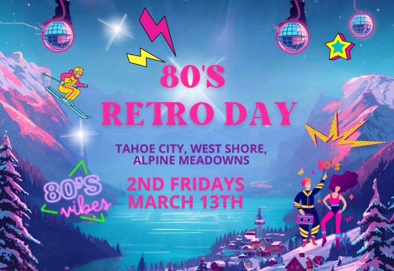 Second Fridays continue with 80s Retro Day on this Friday, March 13 in Tahoe City, West Shore Lake Tahoe, and Alpine Meadows — bringing throwback fun, themed entertainment, activities, specials, and more.