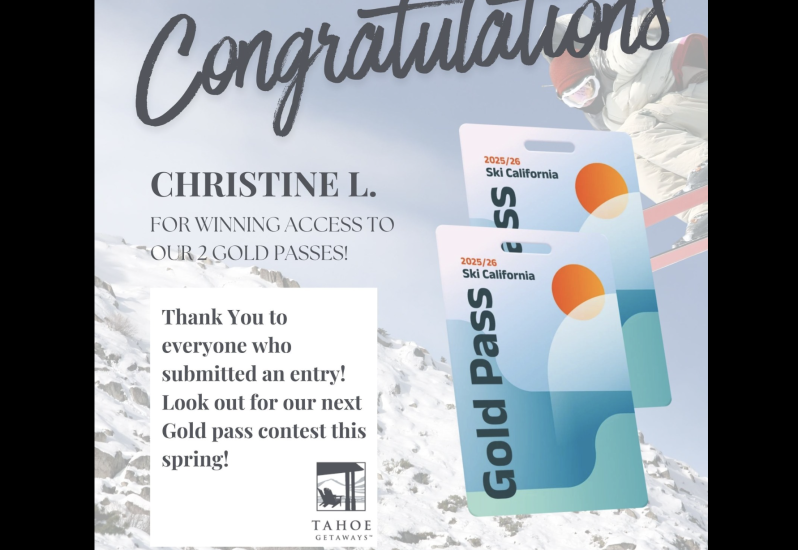 Congratulations to Christine L.! Thank you to everyone who submitted an entry to win access to our two California Gold Passes during her Tahoe Getaway! Be sure to look out for our next contest this spring!