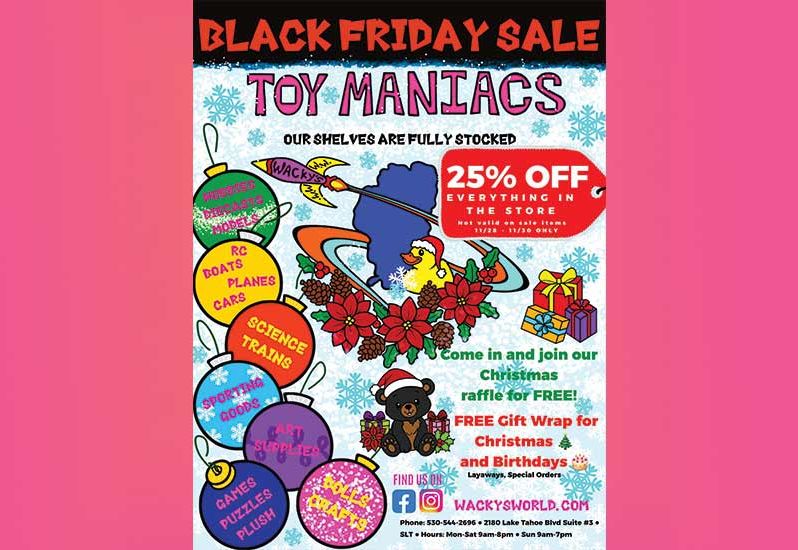 20 hours agoBlack Friday is on the way! 25% off Storewide! Don't miss it! Black Friday is on the way! 25% off Storewide! Don't miss it! Black Friday is on the way! 25% off Storewide! Don't miss it! Click here for more posts from Toy ManiacsToy Maniacs 2180 Lake Tahoe Boulevard#3South Lake Tahoe, CA(530) 544-2696Website DirectionsCall us